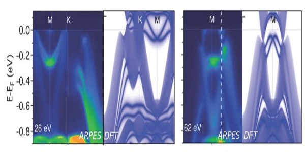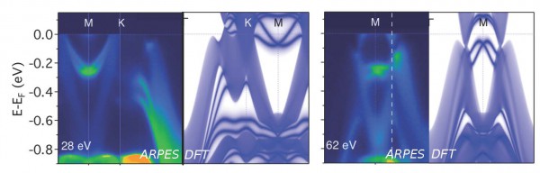 Figure 1: Comparison between the experimental ARPES data and the simulated (DFT) surface spectral density, the sharp features with linear crossings at the point M correspond to surface states.