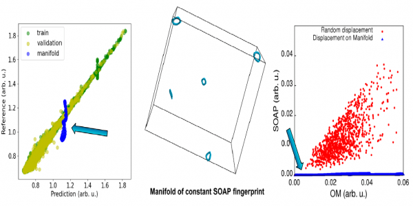 In Figure 1, the central panel shows trajectories of a rotation and translation-free movement of the methane molecule on a manifold of quasi constant SOAP fingerprint. The blue points in the right panel show the fingerprint distances for configurations on this manifold. The fact that they are quasi zero indicates that the SOAP fingerprint is quasi constant. An alternative Overlap Matrix (OM) fingerprint recognizes however the structural differences. The red points show the much larger SOAP fingerprint distances for other movements with smaller or similar atomic displacements. The left panel shows the machine learning capabilities for a torsional energy. The torsional angles change on the manifold, but since the fingerprint is quasi constant the torsional energies on the manifold are also quasi constant (blue points) and do therefore not capture the correct variation of the torsional energy. For the points off the manifold, shown in green/yellow, the variation of the torsional energy can however be well tracked.