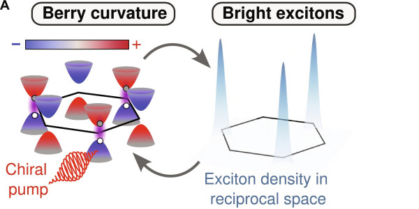 Illustration of Berry curvature texture and exciton population along with the schematic of the experimental measurement protocol. From Schüler et al., Science Advances (2024)
