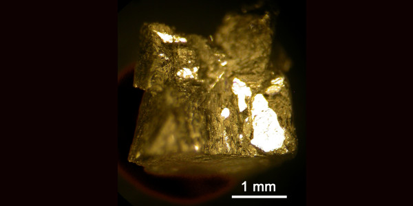 A crystal of Pt2HgSe3, or jacutingaite, grown in the Laboratory for Quantum Materials Discovery, DQMP, University of Geneva. Image from I. Cucchi et al., “Bulk and Surface Electronic Structure of the Dual-Topology Semimetal Pt2HgSe3” Phys.Rev.Lett 124, 106402 (2020).