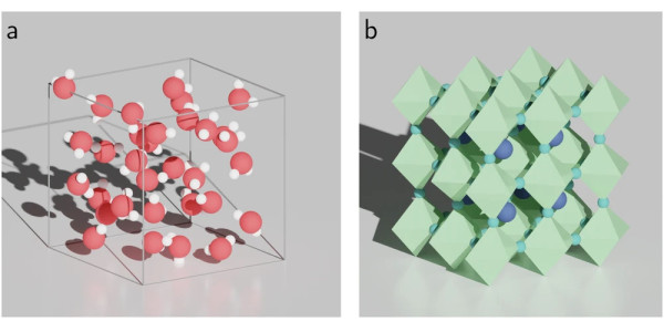 The two systems studied in this work. Liquid water, with oxygen atoms shown in red and hydrogen in white. b The halide perovskite CsSnI3, with caesium atoms in blue, tin polyhedra in green, and iodine in teal. From Schubert et al, npj Comput Mater (2024).
