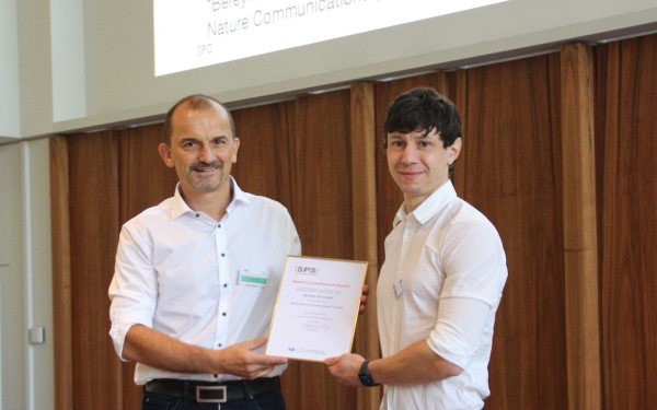 Michele Simoncelli (on the right) receives the award from Sven Friedel, managing director of COMSOL Multiphysics, Zurich. Credit: Swiss Physical Society.