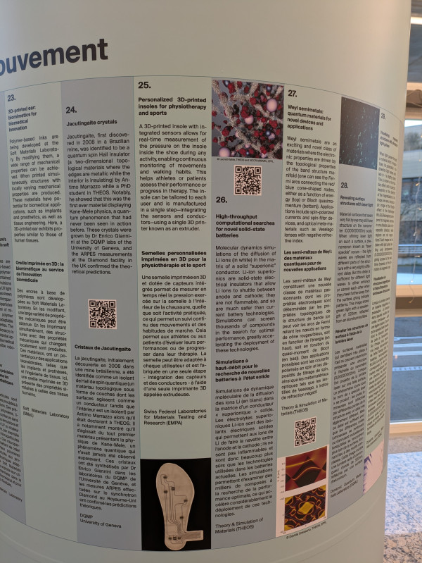 Jacutingaite crystals are also on display, telling the story of this material that was first discovered in 2008 in a Brazilian mine, and was identified to be a quantum spin Hall insulator (a two-dimensional topological materials where the edges are metallic while the interior is insulating) by Antimo Marrazzo while a PhD student in THEOS. These crystals were grown by Dr Enrico Giannini at the DQMP labs of the University of Geneva, and the ARPES measurements at the Diamond facility in the UK confirmed the theoretical predictions.