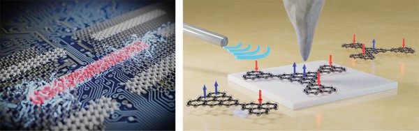 Artistic sketch of future envisaged applications for carbon based nanomaterials. On the left 1D nanomaterials that are fabricated in the nanotech@surfaces Laboratory of Empa when transferred to the Transport at Nanoscale Interfaces Laboratory are integrated into prototypical devices (image credit M. L. Perrin, Empa). Both fabrication process and integration into devices require simulations of the structural and electronic properties of the novel nanomaterials in gas phase and on substrates. On the right, magnetic carbon-based nanomaterials are produced with engineered exchange coupling (image credit P. Ruffieux, Empa). The magnetic properties of the nanomagnets are measured via single spin electron paramagnetic resonance spectroscopy (STM-EPR). Simulation frameworks to complement the experiments will be developed.