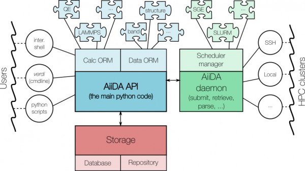 Caption: The main components of the AiiDA infrastructure and their interactions. The core AiiDA component is the API, whose ORM represents stored objects as python classes. AiiDA supports any computational code and data type via a plugin interface. The AiiDA daemon is a background process that takes care of most automated operations such as job submission, scheduler state check, file retrieval and parsing. It interacts with the remote clusters via different channels (local, ssh, . . . ) using the appropriate scheduler plugins.