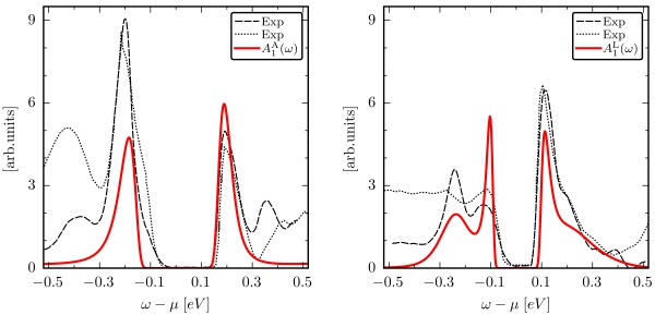 Figure 1. Comparison between the theoretical spectral function (red line) of the surface layer and the recent measurements from "Mottness versus unit-cell doubling as the driver of the insulating state in 1T–TaS2" and "Distinguishing a Mott Insulator from a Trivial Insulator with Atomic Adsorbates" (black lines) for the A (a) and L (b) termination.