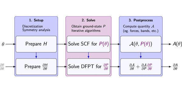 The new AD-DFPT framework presented in the study allows a DFT code, the Density-functional toolkit (DFTK) created by Herbst’s lab, to interact seamlessly with a general-purpose AD system. Take as input a key parameter for a calculation, for example a specific geometry of the system. The workflow goes through a set-up stage that prepares the problem by applying discretization and symmetry analysis, a solution stage that determines a ground-state solution, and a postprocessing stage that yields the desired physical quantities such as total energy, forces, or band structure.