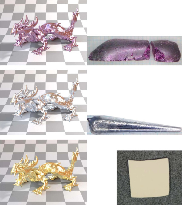 Comparison between the simulated rendering of a metallic surface (left panel) and real samples (right panel) of the intermetallic compounds AuAl2 (top), AuGa2 (centre) and PtAl2 (bottom). Adapted from Prandini, G., Rignanese, GM. & Marzari, N. Photorealistic modelling of metals from first principles. npj Comput Mater 5, 129 (2019). https://doi.org/10.1038/s41524-019-0266-0.