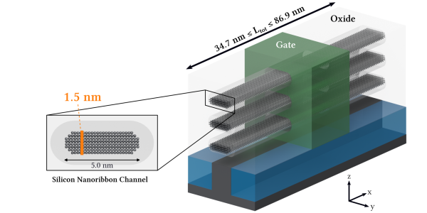 Schematic of a silicon nanoribbon field-effect transistor with three nanoribbon layers stacked on top of each other. The central ribbon was simulated by the team. (Image Credit: N. Vetsch et al. 2025