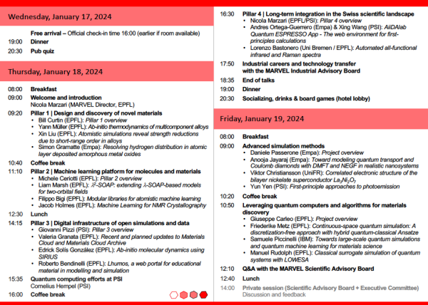 The sessions were then structured around the main pillars of NCCR MARVEL: on the first day, the sessions on Design and discovery of novel materials, Machine learning for molecules and materials, Digital infrastructure of open simulations and data, Long-term integration in the Swiss scientific landscape were introduced respectively by William Curtin, Michele Ceriotti, Giovanni Pizzi, Nicola Marzari, all of whom were followed by presentations of individual lab members focussing on key results and case studies.